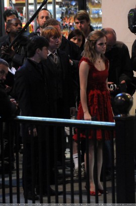 Not to be outdone, Brazilian HP fansite Oclumencia.com.br has released a TON of set pics from what are apparently the post-wedding scenes of the early chapters of Deathly Hallows. Minor spoiler: Those who have read the book recall that an idyllic summer wedding at the Weasley home (The Burrow) is violently interrupted by a raid of Death Eaters, and our three young heroes have to make a hasty escape to the streets of London. Have a look at our golden trio dressed to the nines below: