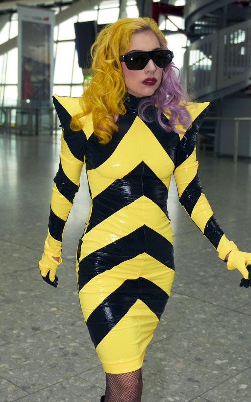 The video will have Beyonce in it, just like the “Videophone” video featured Gaga. For now, enjoy the photo of Lady Gaga in her bee outfit taken late last week.-Dr.FB