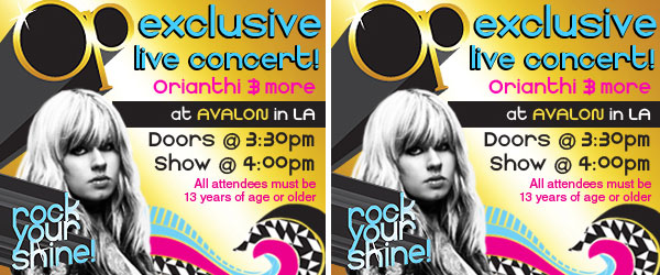 Orianthi will play a small show in LA this Thursday afternoon as part of the Wal-Mart OP “Rock You Shine” event. The event is being held at the Avalon in Hollywood and runs from 4-6pm (doors open at 3pm). You must be over 13 to attend.