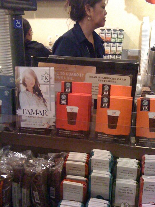 So, while Tamar Kaprelian has been on tour, she usually visits airport coffee shops and she leaves her mark. No, she doesn’t open sugar packs and put them back. The mark I am talking about is that she leaves a few promo cards of herself and upcoming CD, (which the doc still does not have an advance copy of to blast over L.A. by the way..ahem.) and takes photos of it.