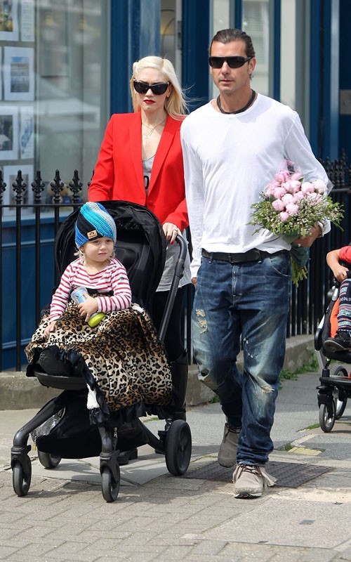 Gwen Stefani & Gavin Rossdale have been in London all week and were spotted taking the kids, Zuma & Kingston for a stroll. I am digging the flowers Gavin is holding.