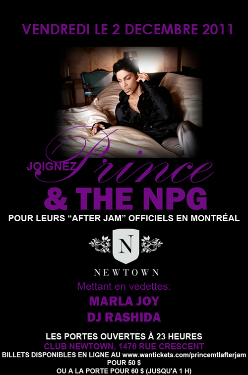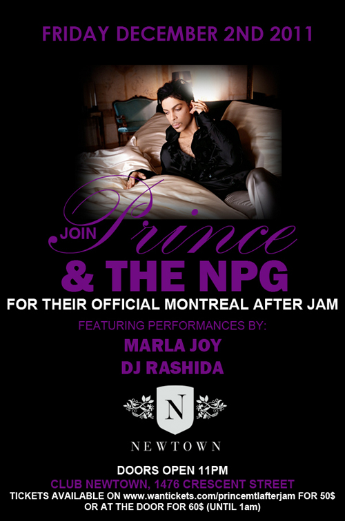 Montreal, Prince is having an official NPG afterparty tonight at Club Newtown with a performance by Marla Joy & DJ Rashida will be putting you in the mix.
