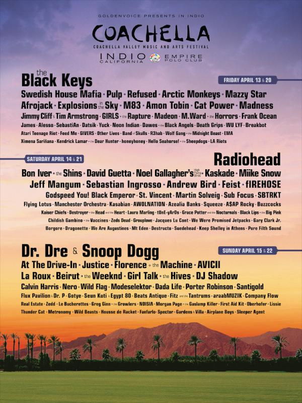 The official Coachella line up was released today with Radiohead, The Black Keys, Dr. Dre & Snoop Dog and Pulp being announces as acts for the festival. To me, it is not very impressive.