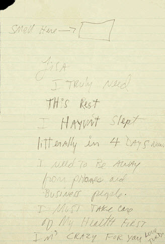 “Lisa I truly need this rest I haven’t slept litterally (literally) in 4 days now. I need to be away from phones and Business people. I must take care of my health first Im’ (I’m) crazy for you Love Turd.”