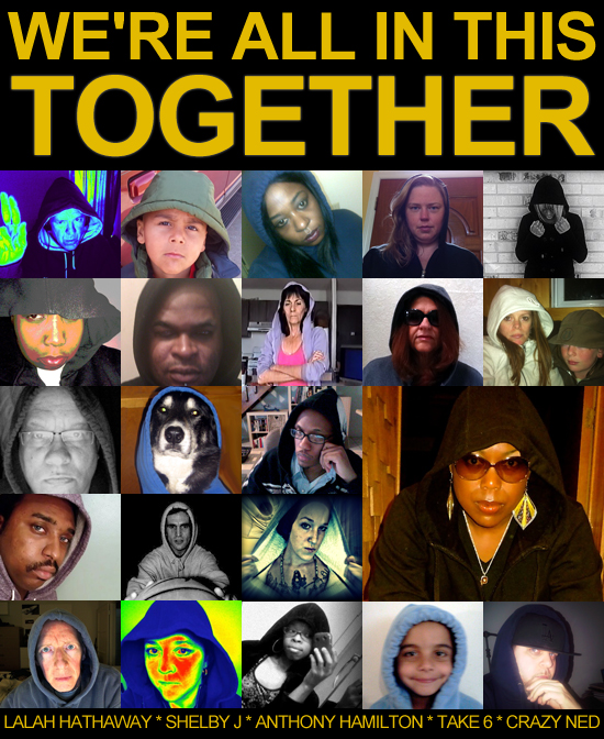 A few months ago, after the Trayvon Martin incident, we asked readers of Drfunkenberry.com to send in photos of them in hoodies and we would use it for a future project. That project is a special cover of the Lalah Hathaway “We’re All In This Together” song featuring Shelby J., Anthony Hamilton, Take 6 & Crazy Ned.