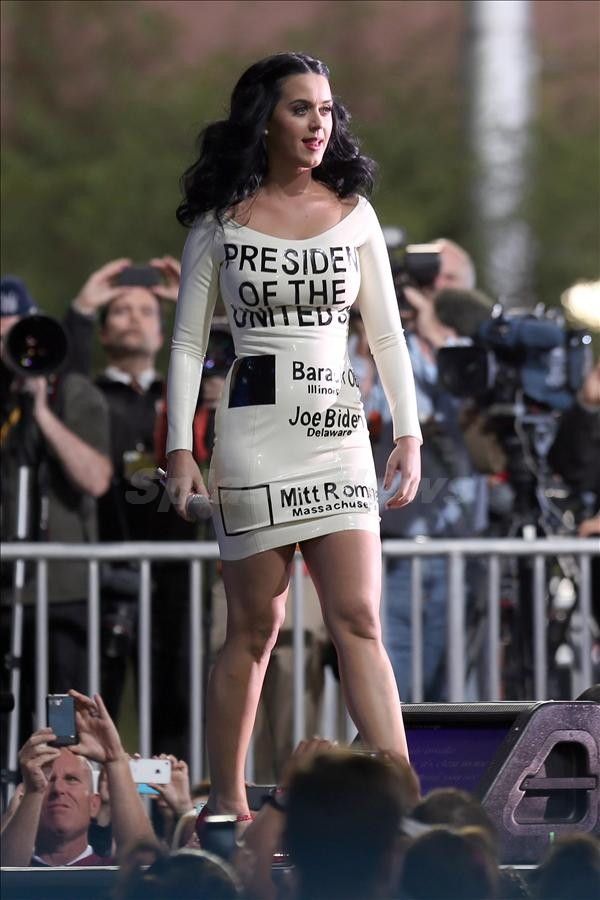 Katy Perry performed at a rally for President Obama in Las Vegas yesterday, wearing a ballot as a dress that was marked in for Obama.