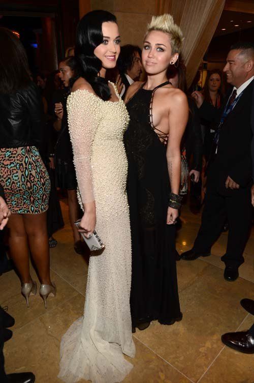 Both songstresses looked amazing with Miley showing the ever-popular side-boob and Katy looking elegant. We are partial to Katy and you all know why.