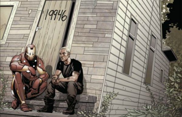 Marvel Comics has released a variant cover of The Mighty Avengers which features EMINEM and Iron Man sitting in front of Em’s house growing up.