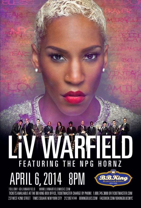 Liv Warfield & The NPG Hornz are going to perform in New York on April 6th, 2014 at B.B. King Blues Club. That is 2 days after her performance on The Late Show With David Letterman.