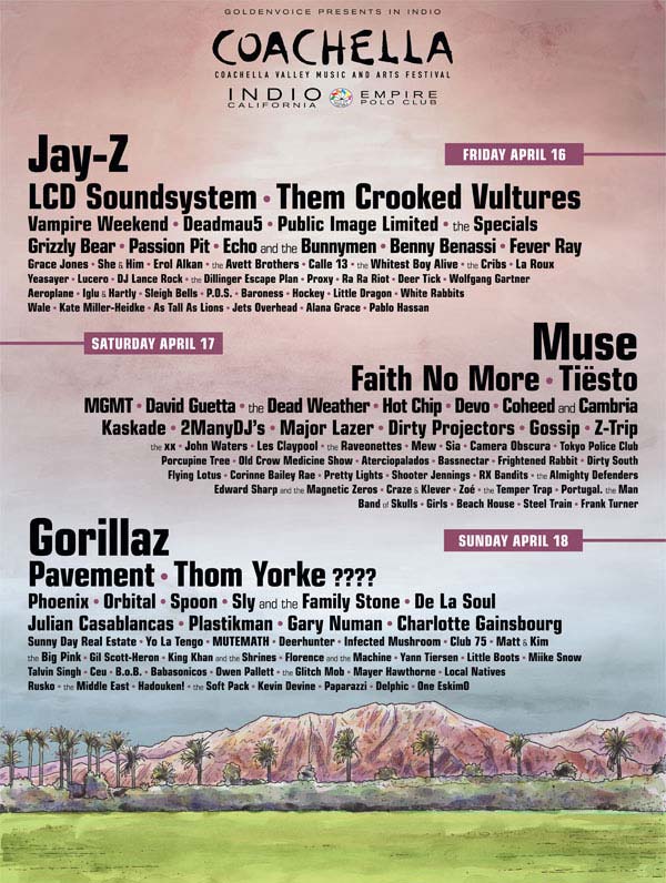 [caption id="attachment_17987" align="aligncenter" width="309" caption="Click to enlarge"][/caption] This year's Coachella Music Festival will be headlined by Jay-Z on Friday, Muse on Saturday and the Gorillaz on Sunday (April 16-18). Sunday sounds like...