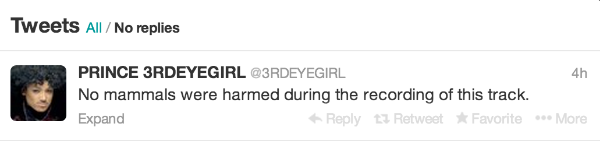 Around 1:41 A.M., 3RDEYEGIRL (Prince's official Twitter account) asked "Who wants to deliver this stolen Prince demo to the needy?" Hmm. To instead of 2. No caps lock issue. People were responding to the tweet with a frenzy....until one was chosen.
