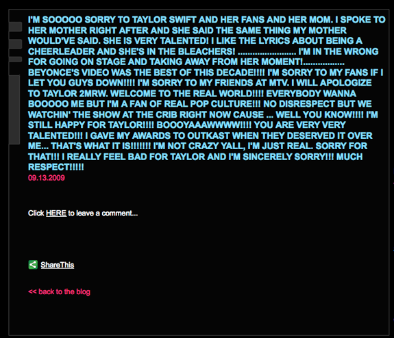 [caption id="attachment_14168" align="aligncenter" width="410" caption="Screen Shot of Kanye's Apology. Photo: KanyeWest.com"][/caption] Kanye West took to his blog/web site to issue an apology for his douchey actions at the MTV Awards towards...