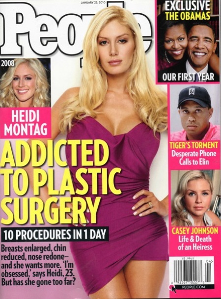 [caption id="attachment_17806" align="aligncenter" width="410" caption="Heidi Montag. Photo: People.com"][/caption] 10 plastic surgeries in one day? Sigh. These reality stars. Lame. It's too bad she did not have the fat sucked out of her ass. When I...