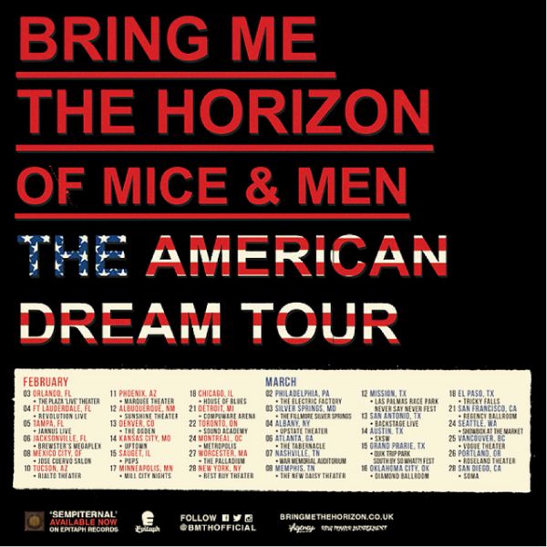 Next week, Of Mice & Men will join Bring Me The Horizon for 'The American Dream Tour' - an extensive run of North American dates that will kick off on Monday, February 3rd in Orlando, FL and wrap up on March 28th in San Diego, CA.